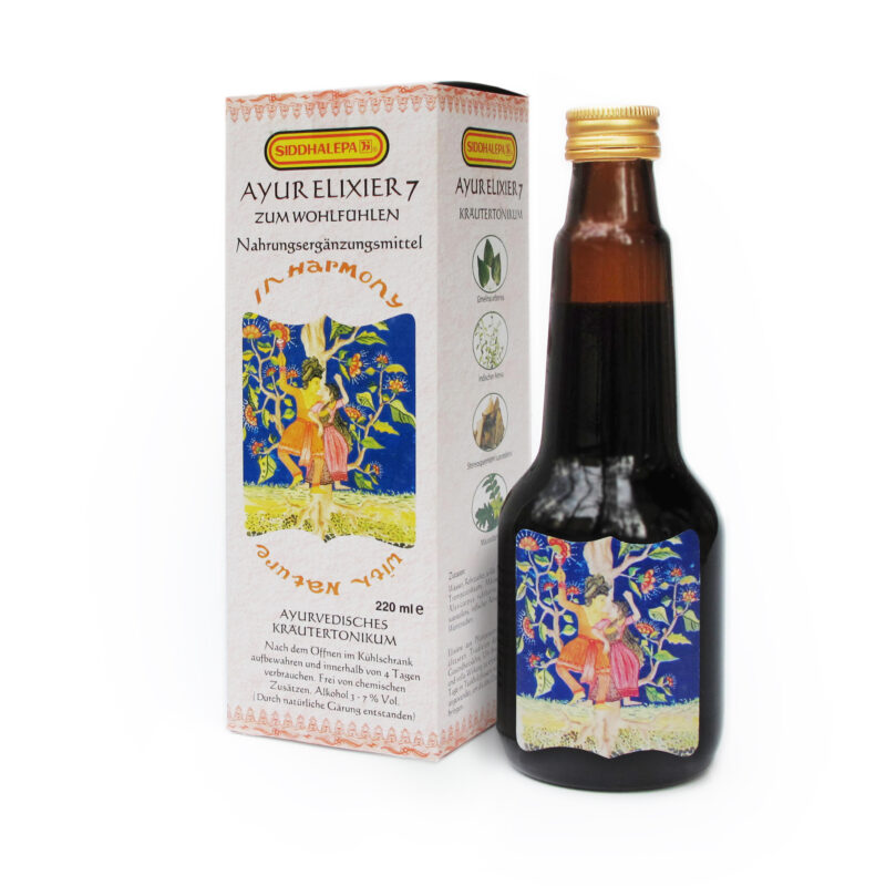 Die ELIXIERE bestehen aus natürlichen, ayurvedischen Pflanzenextrakten und werden 45 Tage lang in Teakfässern gereift. Die gewonnenen Kräutersäfte enthalten 3-6% Alkohol aus natürlicher Selbstgärung.